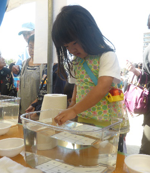 内容は夜店のコイン落としと同じで水を満たした水槽の底にスリーアイズシートの縮小版を貼りましてコインを落としスリーアイズ同様並べて得点を競う、というものです。