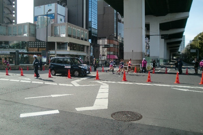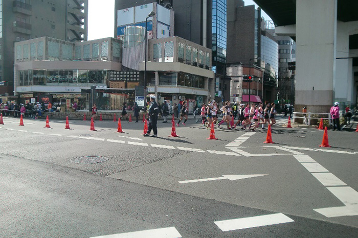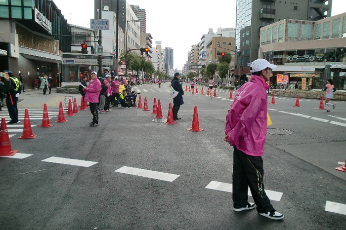 私達が沿道警備していた森ノ宮交差点で、ハーフマラソンの選手の方々は3往復、国際女子マラソンの選手の方々は2往復、と駆け抜けていく沿道警備ポイントでした。