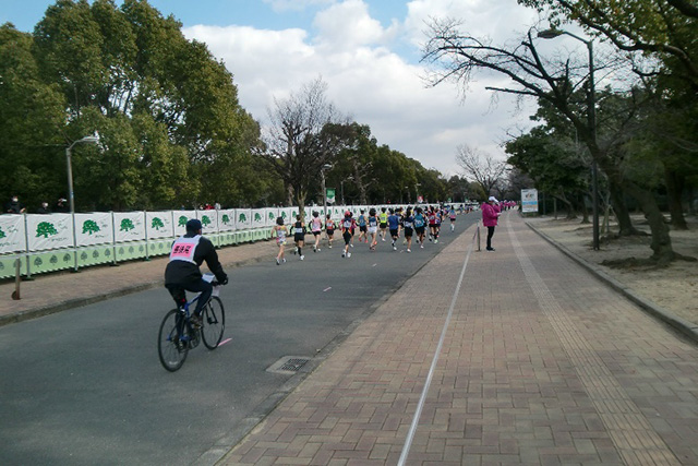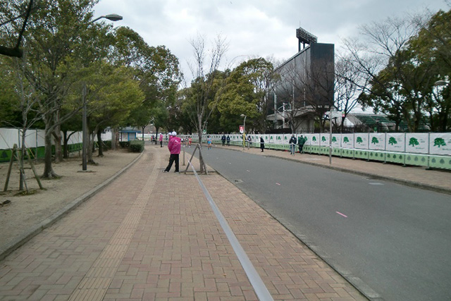 長居公園周回路を14周5分の4周走るコースで、観客の声援も無く背面警備で立っているとランナーの走る靴音と呼吸音が聞き取れるぐらい静かな大会でした。